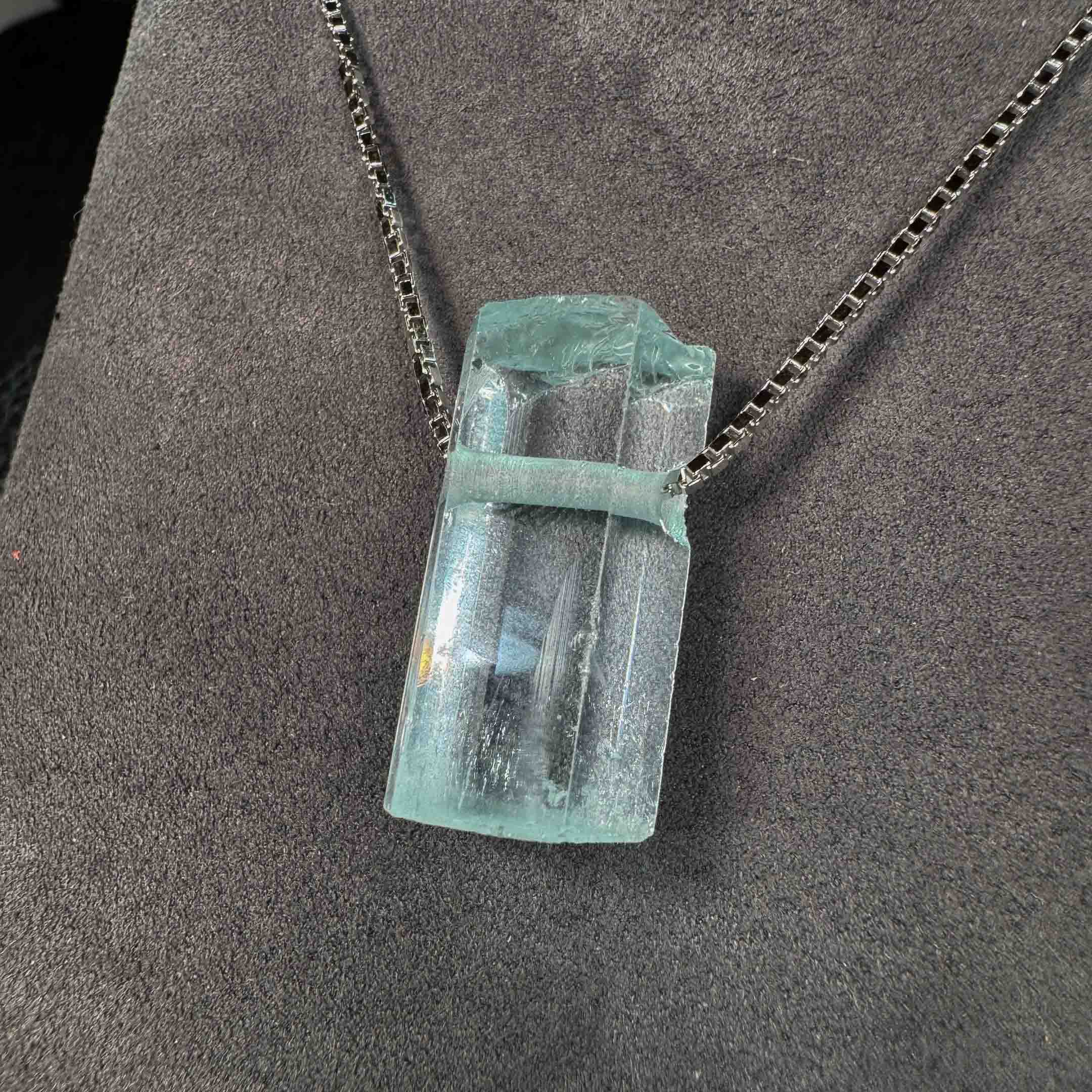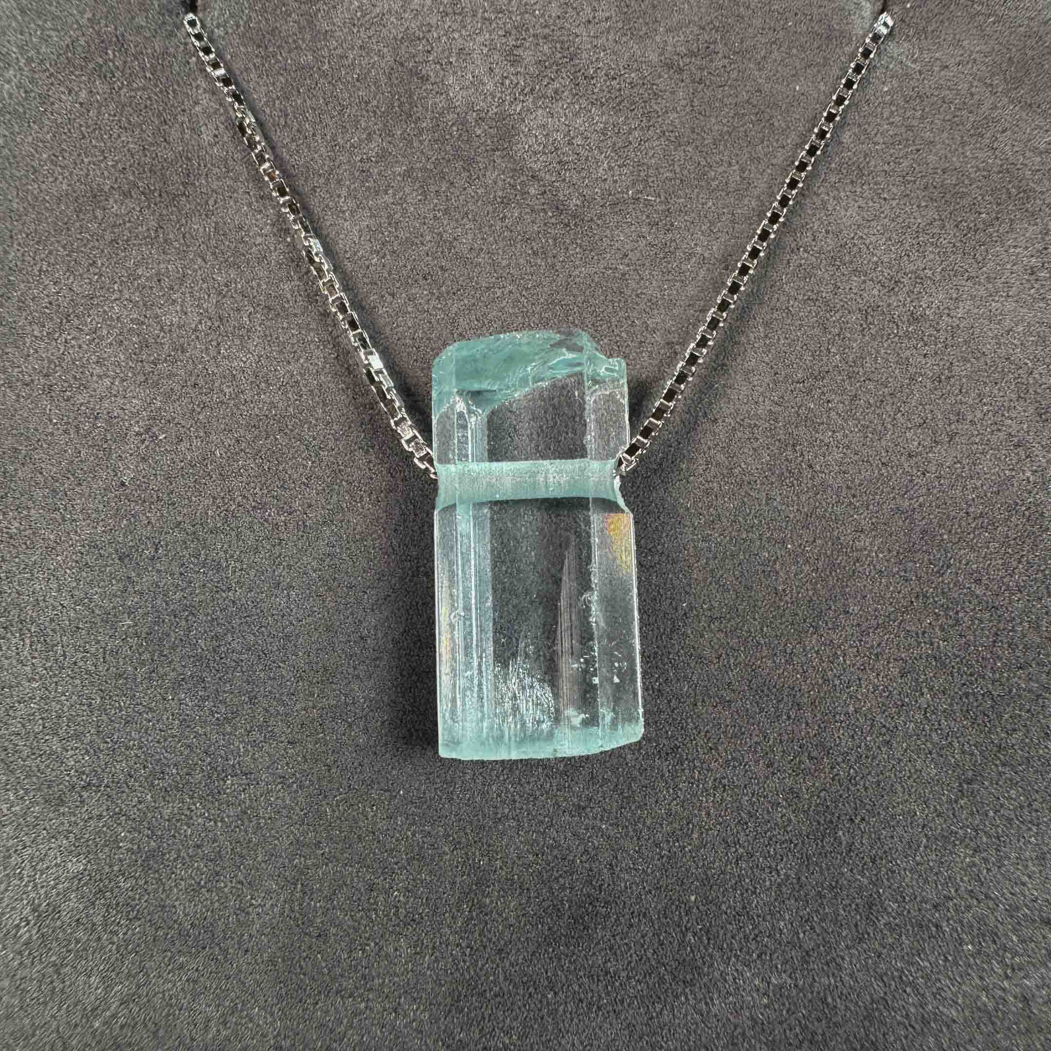 This natural crystal has a light blue color and termination at the bottom. It means that it has naturally finished growing at the bottom.
