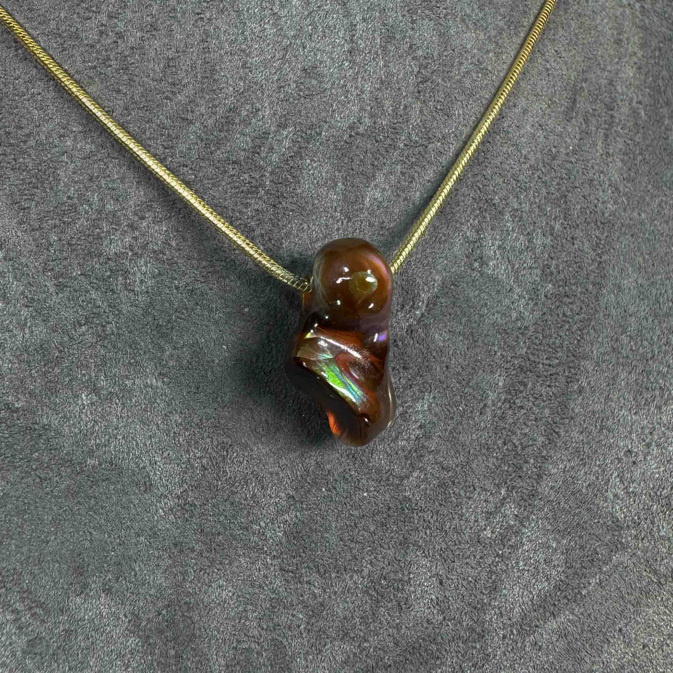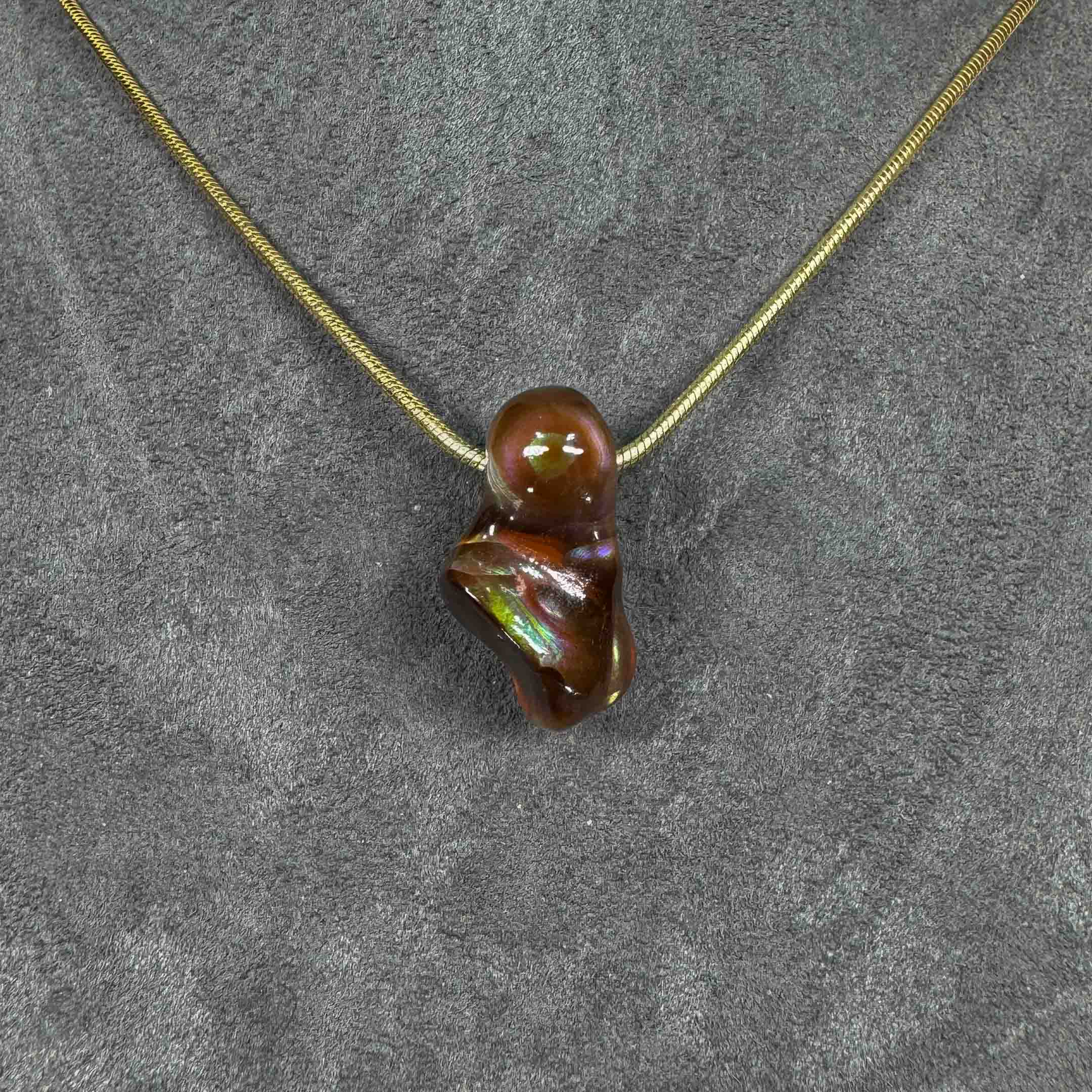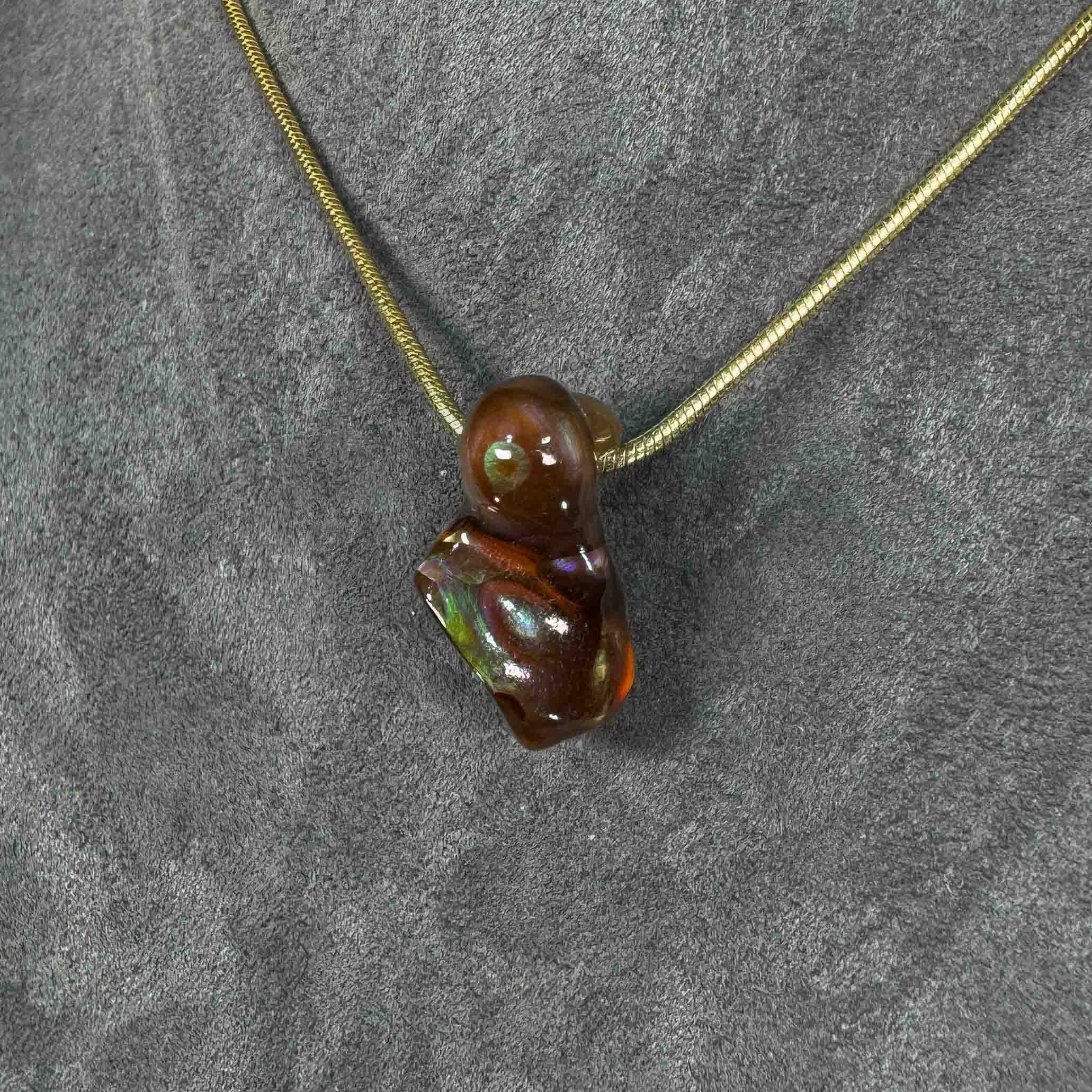 Aus diesem selbstgeschliffene Feuerachat leuchtet auf der oberen hälfte ein wunderschönes grünes Auge heraus.